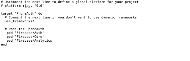 BUT!!!! 위에서 pod 파일에 pod 'Firebase/Analytics' 를 쓸 때!!! pod 'Firebase/Auth' pod 'Firebase/Core'도 같이 적어야한다!! 반드시!! 그 이유는 저런 한 줄 한 줄이 바로 내가 구글에서 이용하겠다고 선언하는 서비스들이기에 여기서 Auth를 선언하지 않으면 로그인연동을 구현할 수 없다. 밑은 pod파일의 예시이다.