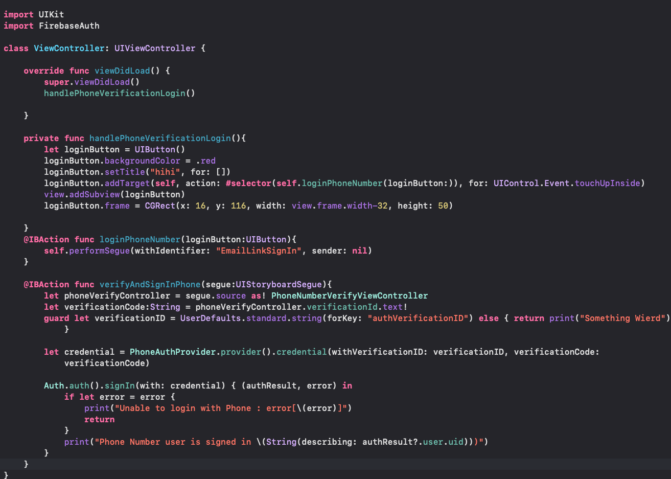 전체적인 구조는 view가 로드되면 handlePhoneVerificationLogin 함수가 실행된다. 이 함수는 loginButton버튼을 프로그래밍적으로 만들고 여기서 중요한것은 loginButton에 addTarget을 하는 부분이다. 이것은 이 버튼이 눌릴 때 loginPhoneNumber(loginButton:UIButton)함수가 실행된다는 것이고 그 함수는 EmailLinkSignIn세그웨이를 실행하여 2번째 ViewContoller로 이동한다. 밑의 verifyAndSignInPhone 함수는 이 화면으로 다시 올 때 실행되는 부분이므로 밑에서 설명하기로 하자!