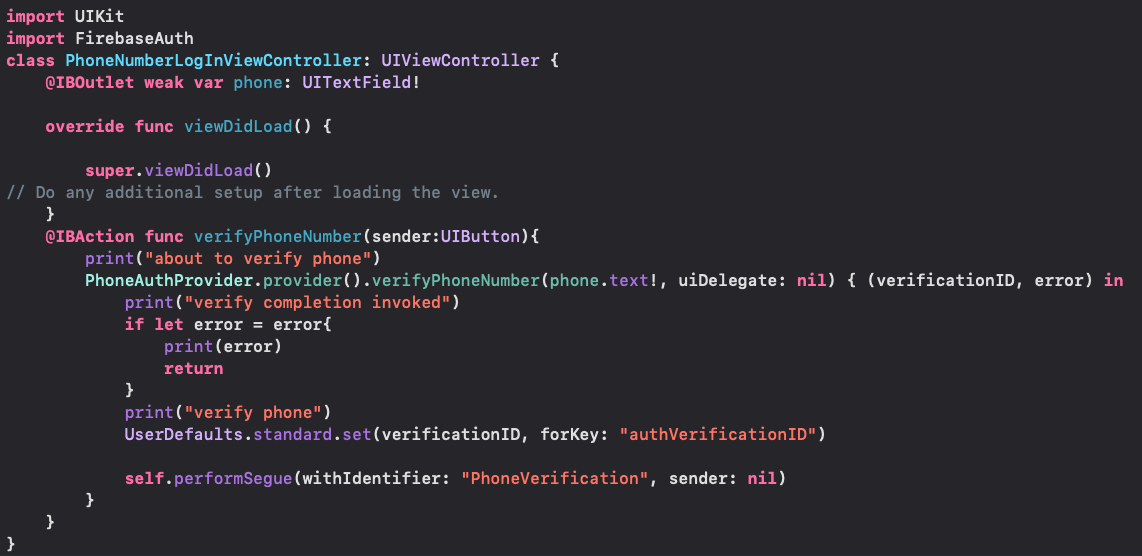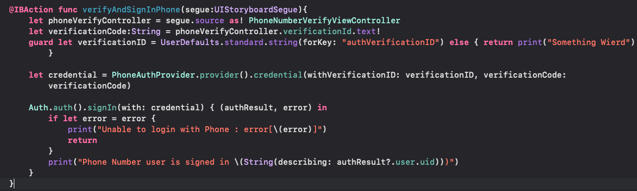 안을 보면 PhoneAuthProvider.povider().verifyPhoneNumber는 구글이 만들어논 함수로 휴대폰 인증을 시작하는 함수이다. 보면 text를 필요로하는 걸보면 휴대폰으로 문자를 보내려고 하는 것 같다. error가 생기면 함수를 끝내고 그게 아니면 UserDefaults라는 가벼운 내장DB에 authVerificationID라는 키로 VerificationID를 저장한다. 그 후 다음화면으로 넘어가는 segue가 실행된다.