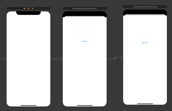 전체적인 구성은 왼쪽에 ViewController에 코드로 버튼을 추가하고 그것은 로그인하기 버튼이다. 그후 2번째 ViewController(PhoneNumberLogInViewController)가 뜨면 거기에 핸드폰번호를 입력하고 3번째 ViewController(PhoneNumberVerifyViewContoller)에 2번째 적은 핸드폰번호로 전송된 인증번호를 입력하고 버튼을 눌러 로그인하는 형태이다.