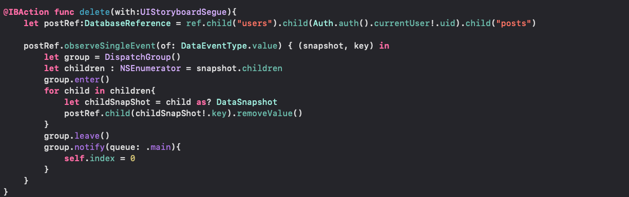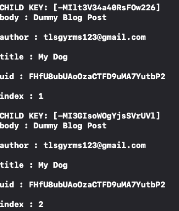 postRef라는 상수는 databaseQuery로 이는 ref라는 참조에서 users안으로 그리고 그 다음에 자신의 uid로 그다음에 posts로 Drill down해서 들어간다. 그 후 거기에 있는 것들을 index값을 기준으로 정렬한 것!!을 참조한다. 그 후 observeSingleEvent(of:){(snapshot, key)}라는 함수가 실행된다. 이 함수는 postRef에 장착(?)될때(리스너가 생성될때!) 딱 한번 실행된다. 즉 read버튼이 눌리면 read함수가 실행되고 그때마다 postRef에 장착되므로 그때 postRef의 snapshot과 key가 클로져의 인자로 넘어간다. 그 후에는 thread와 UI개념때문에 group.enter()를 실행해야한다. 뒤에 group.leave(), group.notify(queue: .main)모두 나중에 따로 다루는 시간을 갖을 것이다. 단지 main thread에서 이 작업을 하지 않고 다른 thread에서 실행 후 main thread에 있는 UI를 업데이트 해준다고 보면 쉽다. 그 사이에 있는 for 문으로 각각의 posts들의 노드들을 형을 변환하여 Child Key와 모든 내용들을 출력하고 있다. 결과는 다음과 같다.