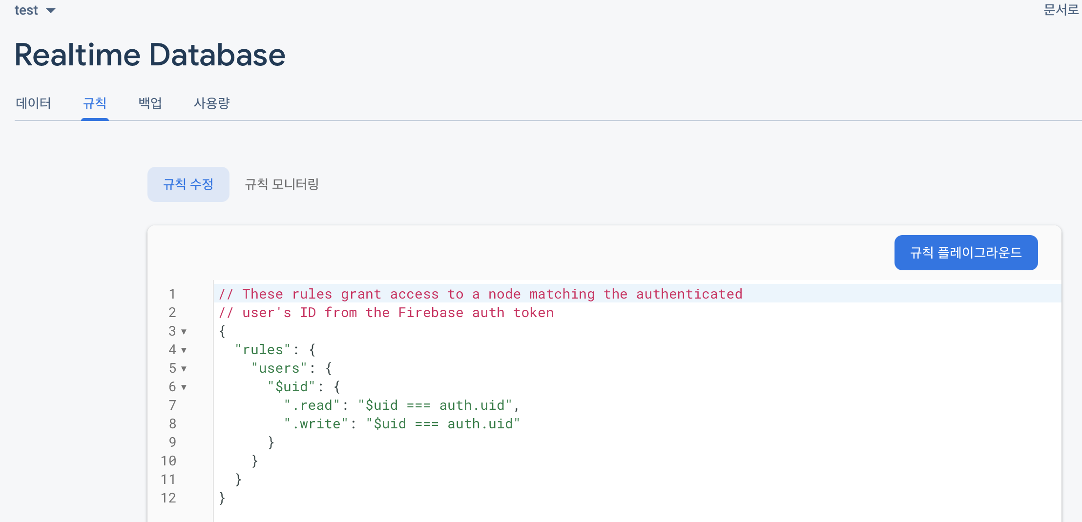 사전에 2개를 이야기하자면 일단은 realtime Database의 규칙을 정의해야한다. 위에 보이는 코드는 users/$uid안에 있는 노드는 로그인을 한다면($uid === auth.uid) 읽고 쓰는게 가능하다는 것이다. 또한 기본 셋팅은 지금 위의 왼쪽에 보이는 화면과 같다. Google login을 구현했지만 그 버튼은 코드로 삽입했기에 위에 보이지 않는 점은 양해바랍니다..ㅠ,.ㅠ