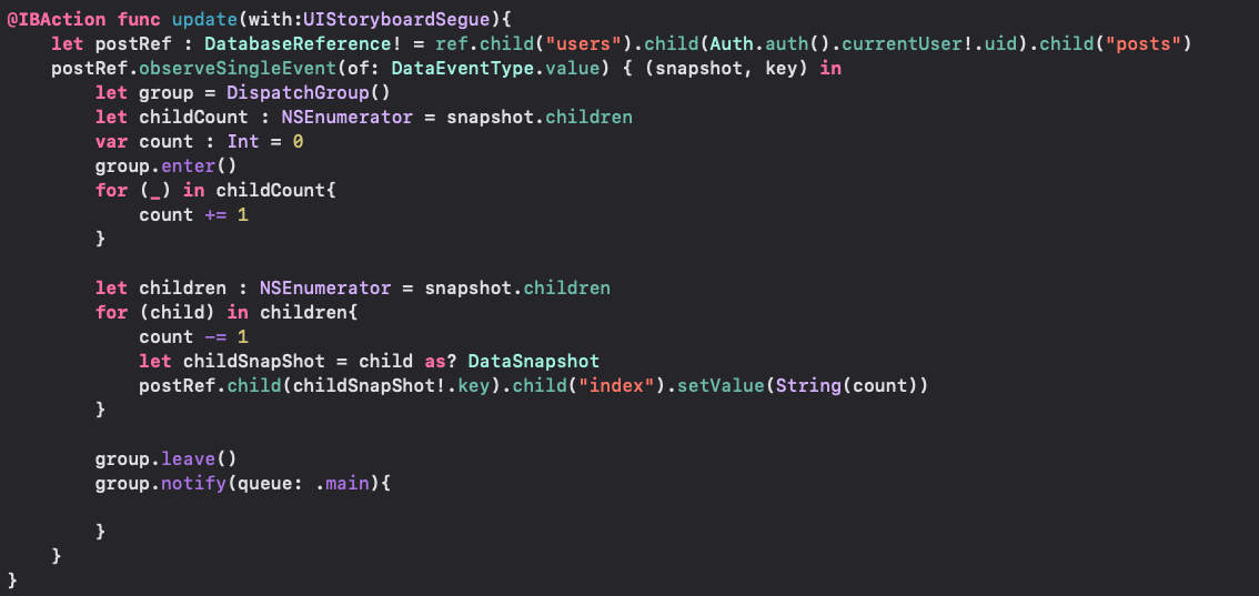 Update의 코드는 위의 Read와 매우 비슷하다고 볼 수 있다. 심지어 코드에 조금 익숙한 사람들은 이 코드가 무엇을 어떻게 업데이트 하는지까지 다 알 수 있을 것이다. 이 코드는 일단 index의 갯수(=count)를 구하고 그 다음에 각 노드의 index값을 전체수-count로 값을 update시키고 있다. 그 때 사용하는 함수는 setValue라는 함수 이고 postRef안에 childSnapShot.key의 노드 안에 index의 값을 업데이트 하는 것이다.
