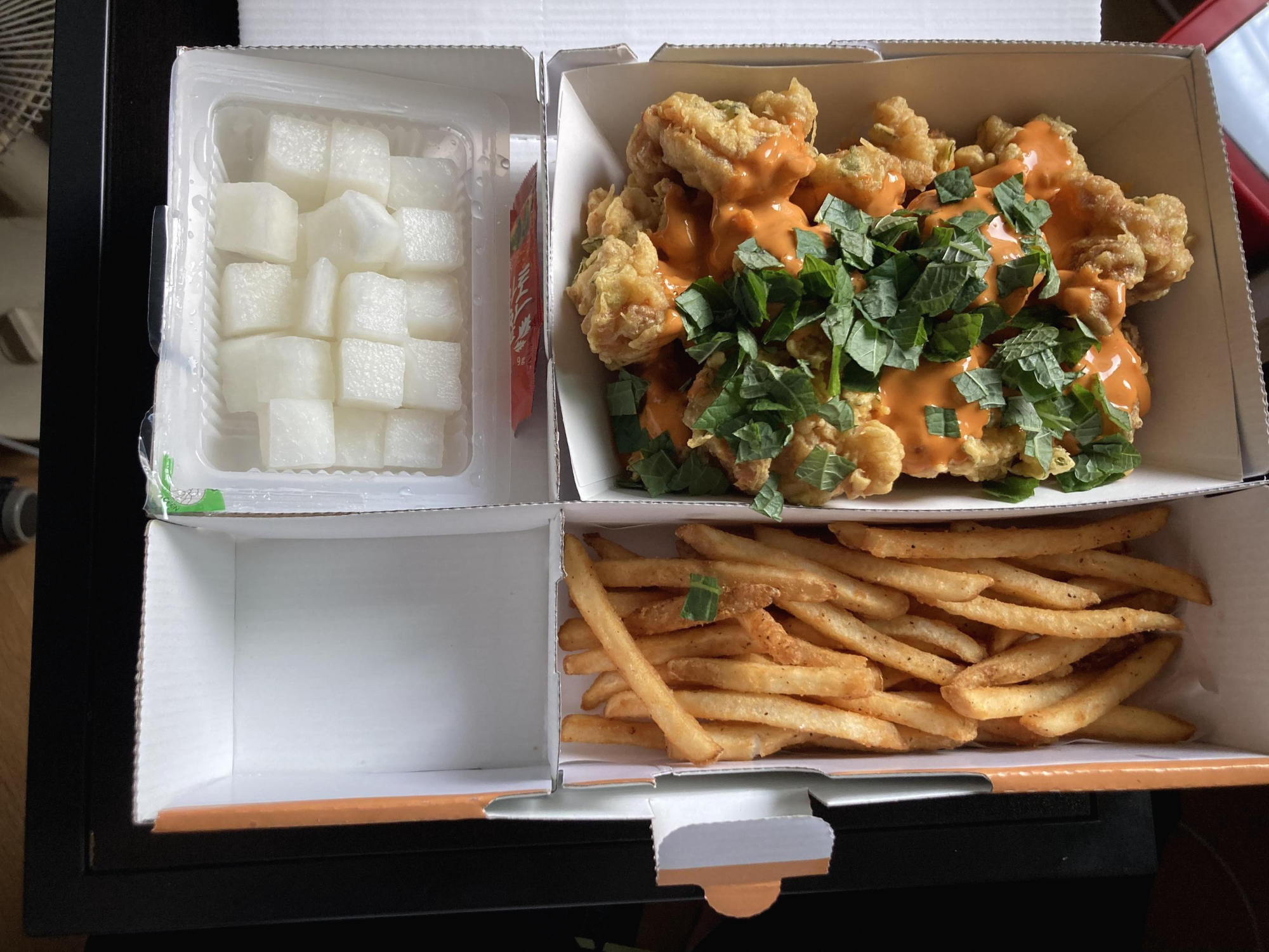 오늘은 집에서 치킨 할인 쿠폰을 받아서 치킨과 낙지만두를 먹었어요! 치킨은 깻잎이 올라간 치킨이었는데 엄청 맛있었어요~! 낙지만두는 부모님이 바깥에서 사서 가져다 주셨어요~!