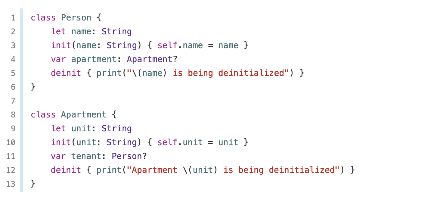 ARC는 이렇게 참조의 갯수를 파악해주고 참조의 수가 0이 되면 그 인스턴스를 메모리에서 해제하는 것도 기능으로 가지고 있다. 이것이 무슨 이야기이냐면 우리가 var apple = Apple()이라고 해서 인스턴스 참조 수가 1일 때 어느 순간 우리가 apple = nil 이라고 한다면 apple은 더 이상 Apple이라는 클래스의 인스턴스를 참조하지 않는 것이다. 그러면 ARC가 이것을 알아채고 참조 수를 0으로 바꾸고 Apple()을 메모리에서 해제 즉 다시 말하면 Apple()을 램에서 제거하고 다른 작업을 위한 공간으로 활용할 것이라는 뜻이다.