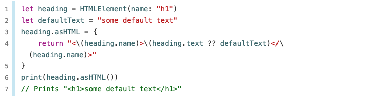 그래서 우리가 만약 다음과 같은 코드를 실행한다면 heading이라는 상수를 클래스를 참조하게 하고 또한 text 프로퍼티 값이 없으므로 그경우의 asHTML 클로저를 조금 개선하고 있다. 여기서 중요한 것은 우리머리 속에 참조횟수를 계속 파악해야 한다. 지금은 정확하게