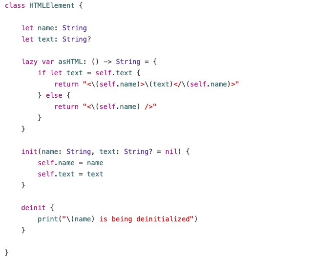 다음을 보면 HTMLElement라는 클래스 내부에 지연 저장 프로퍼티인 asHTML이 보인다. 그리고 그속에서 self.text와 slef.name 등이 사용되고 있는 것들도 보인다. 이것은 HTMLElement라는 클래스 내부의 하나의 프로퍼티인 asHTML 클로저내에서 자신이 속해 있는 클래스를 다시 참조하는 것이다.