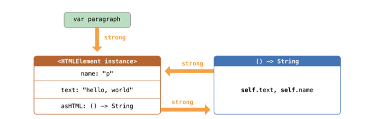HTMLElement 클래스는 2번(1번은 heading상수가 그리고 1번은 클로저 내부에서) 그리고 그 안의 클로저는 한번 참조 되고 있는 것(by 지연저장 프로퍼티에 의해!!)을 알아야한다. 다음의 그림을 참고하자.