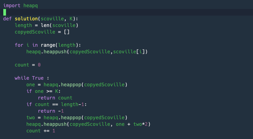 오늘은 알고리즘을 가볍게 하고 싶었어요. heapq를 이용한 가벼운 문제를 풀어봤어요! heapq를 사용할 때 우선순위큐를 일단 만들어줘야한다는 것을 잊으면 안댄다는 것을 배웠어요!! 다음은 문제 링크이고 제가 푼 코드에요~!
