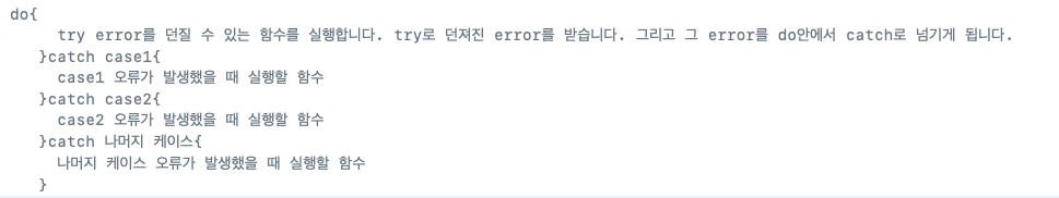 그리고 오류는 던져질 수도 있습니다. 그때 큰 과정 순서는 던진 오류를 받고 그 오류를 처리한다는 것입니다. 다양한 오류 처리 방법 중 첫번째로 do catch구문을 살펴보겠습니다.