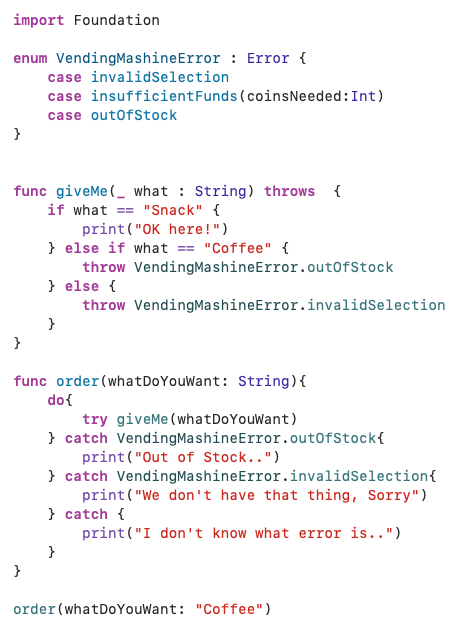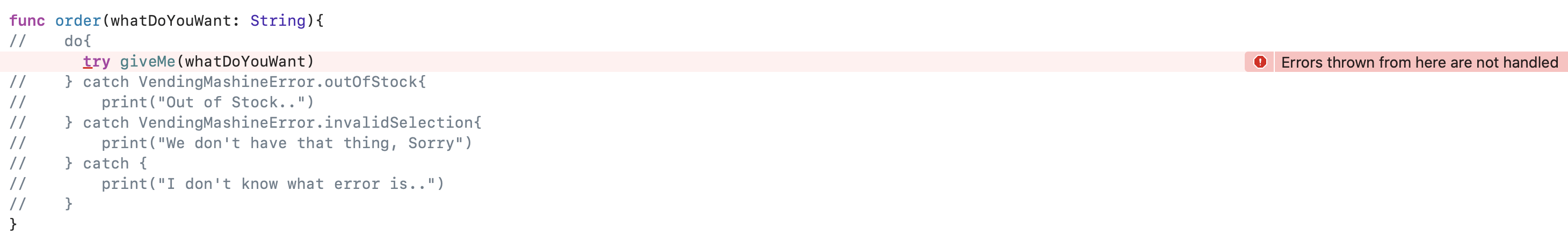 그리고 두번째 함수인 order함수는 이 함수 안에서 giveMe함수를 실행한다 그런데 giveMe함수는 error를 던지는 함수였으므로 order함수는 giveMe함수에 의해 던져진 error를 받아야한다. 여기서 order안의 형태를 보면 do try catch 구문이 보인다. 우리는 이 형태로 error를 받을 것이다.