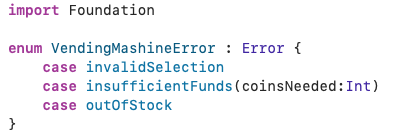 예시는 자판기에서 음료를 뽑을 때 발생할 수 있는 오류들을 열거형(enum)식으로 나열한 것이다. 중요한 것은 Error이라는 프로토콜을 따르는 타입의 값을 통해 표현된다는 것이다. (Error이라는 프로토콜은 안은 비어있지만 단지 구분을 위해서만 존재합니다. 쉽게 말해 그냥 Error이라는 걸 표현하려고 프로토콜을 따른다고만 한거고 프로토콜의 기능적인 요소는 사용하지 않습니다.)