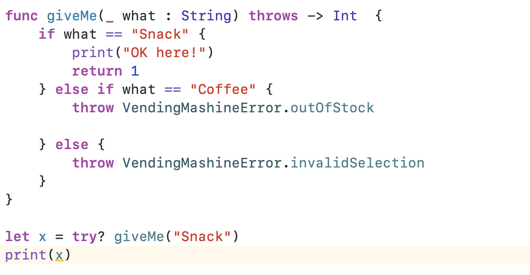 여기서 function이 두개가 있다 첫번째는 바로 giveMe라는 함수로 이 함수는 "func 함수이름() throws{}"라는 형식으로 자신이 에러를 던질 수 있는 함수라고 말하고 있다 그리고 매개변수가 Snack이 아닌 경우는 그에 맞는 에러를 던지고 있다.