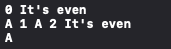 유념해야할 점은 defer가 실행될 때는 역순으로 실해되는 것이다. 이것을 보면 처음에 0출력 한칸띄고 It"s even출력 한칸 띄고 줄바꾸고 A출력! 그리고 i는 1로간다. 1에서는 if절 안에 들어가지 않으므로 줄바꿈은 안 일어난다. 이런식으로 출력하면 그 결과는 다음과 같다.