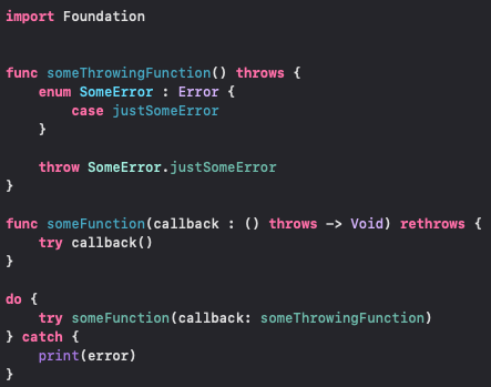 someThrowingFunction이라는 오류를 던지는 함수를 someFunction이 매개변수로 받고 다시 오류를 던진다. 그래서 do catch구문에서 try someFunction을 실행하면 someFunction 안에서 someThrowingFunction이 던진 justSomeError를 someFunction이 받아서 다시 던져서 catch가 처리하는 방식이다.(이해가 안된다면 침착하게 다시 읽으면서 이해해보세요..ㅎㅎ)