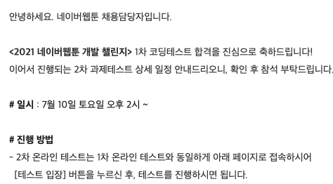 오늘 네이버웹툰 1차 코딩테스트 결과가 나왔는데 합격했어요! 이번주 토요일에 과제형 코테라서 한번 공부좀 하고 봐야할 것같아요!